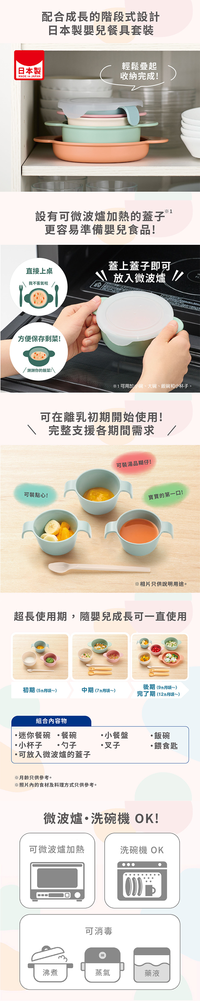 🇯🇵日本製日式離乳收納餐具超長使用期,支援寶寶離乳三階段,可以疊放收納儲存,耐熱度達140°C,可蒸氣消毒、微波、不含BPA,加上餐具色彩豐富,幫助刺激視覺發展,家長買得放心,寶寶食得開心🩷