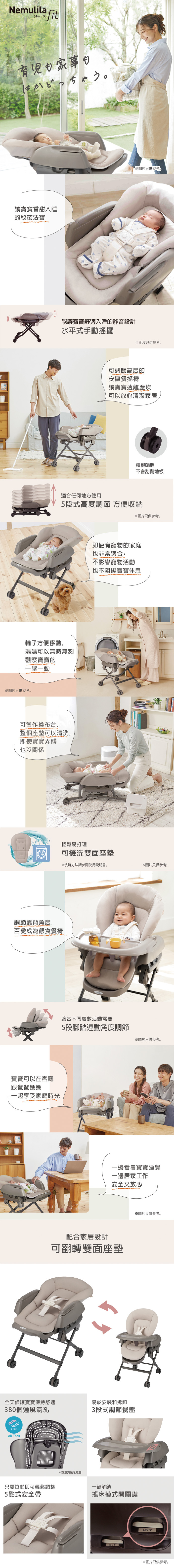 集搖床及餐椅於一身,由初生起適用,使用期長達至約4歲,是嬰兒成長的好伙伴。搖擺模式讓寶寶猶如躺在媽媽的懷抱裏,更容易入睡。