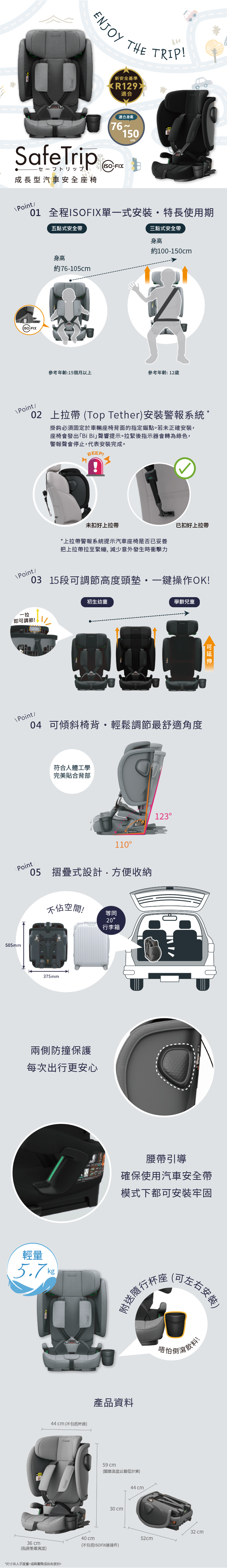 符合最新歐盟 R129 安全基準,守護寶寶每一段旅程!專為 76~150cm 身高的兒童而設,一張座椅陪伴成長每一程,SafeTrip,讓每趟旅程都更安心。🚗